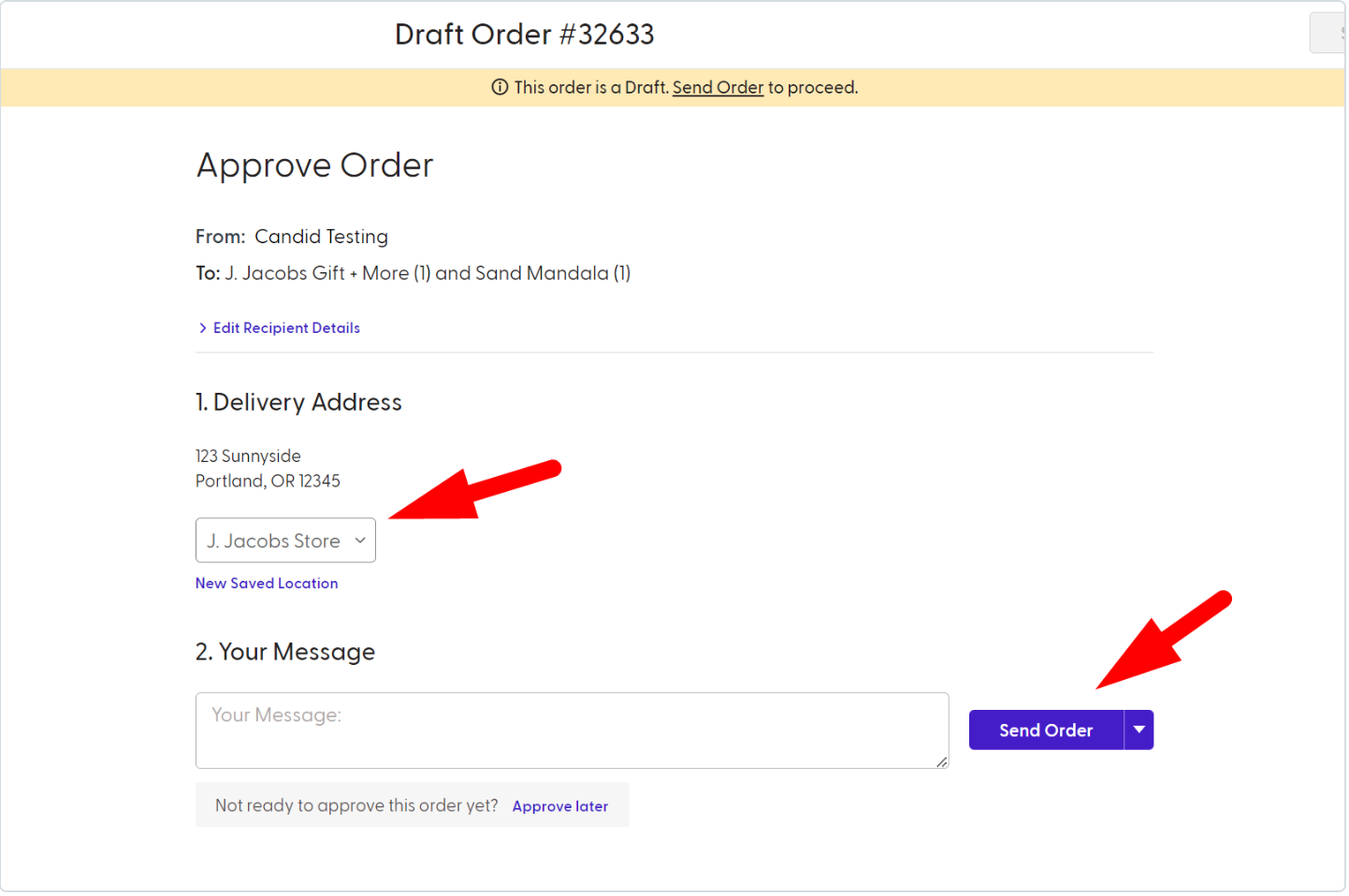 On the next screen you will be asked to enter or select your delivery address. You also have the option to send a message to our team. Once you are done click the "Send Order" button:
